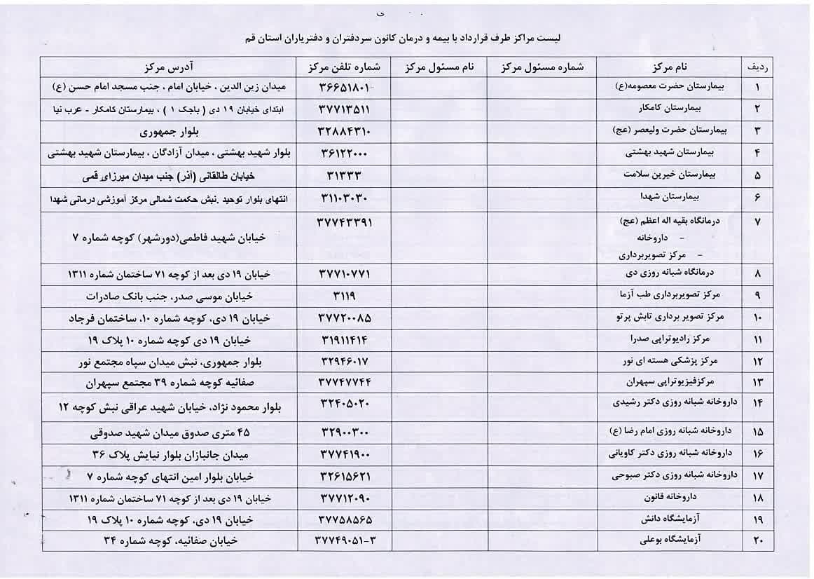لازم به ذکر است اخیرا با انعقاد قرارداد همکاری درمانی و پزشکی با دانشکده علوم پزشکی استان قم، بیمارستان های دولتی تحت پوشش این دانشگاه شامل بیمارستان شهید بهشتی، بیمارستان حضرت معصومه (س)، بیمارستان کامکار، بیمارستان خیرین سلامت و بیمارستان شهداء نیز آماده ارائه خدمات به همکاران محترم سردفتر و دفتریار به صورت رایگان می باشند.